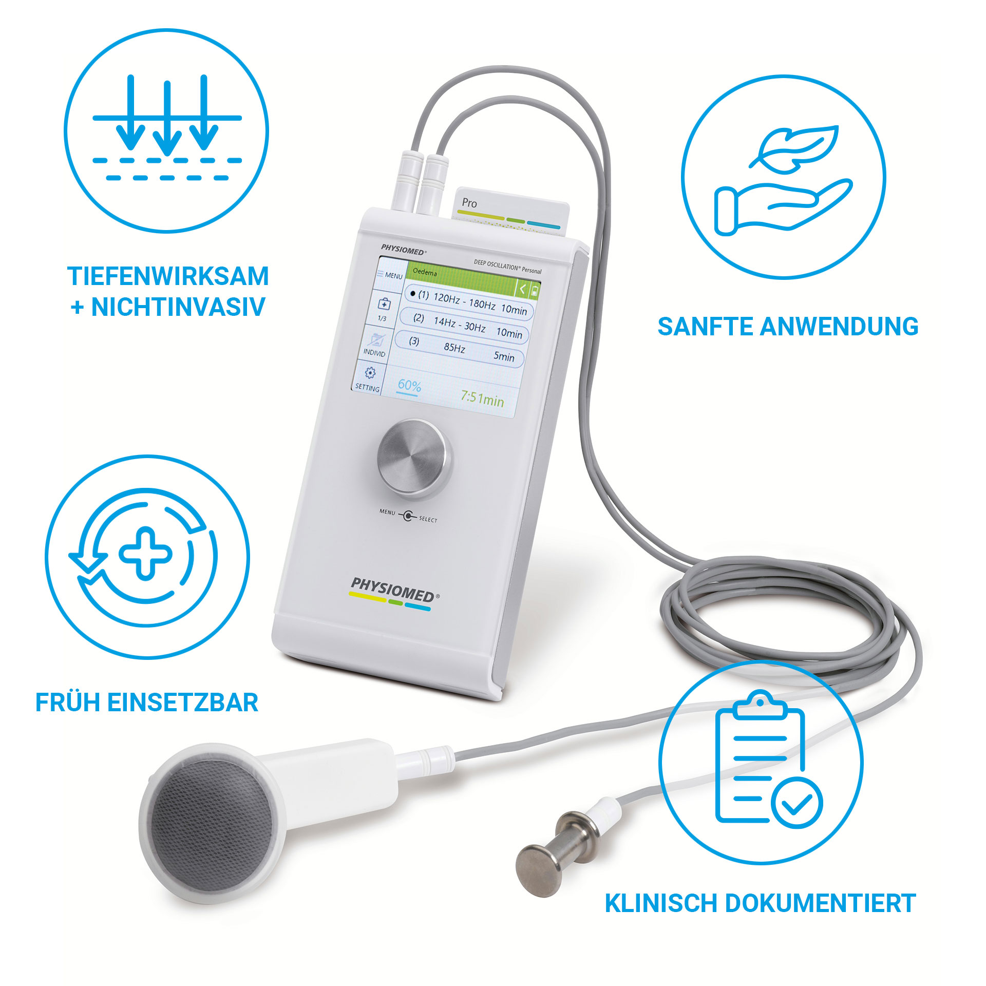 DEEP OSCILLATION Basic ist das kompakte Einstiegssystem in die bewährte Tiefenoszillationstherapie von PHYSIOMED. Die nichtinvasive Therapie wirkt direkt im Gewebe sanft in der Anwendung, tief in der Wirkung. Optimal geeignet für Orthopädie, Sportmedizin, Lymphologie, Neurorehabilitation und Wundmanagement.