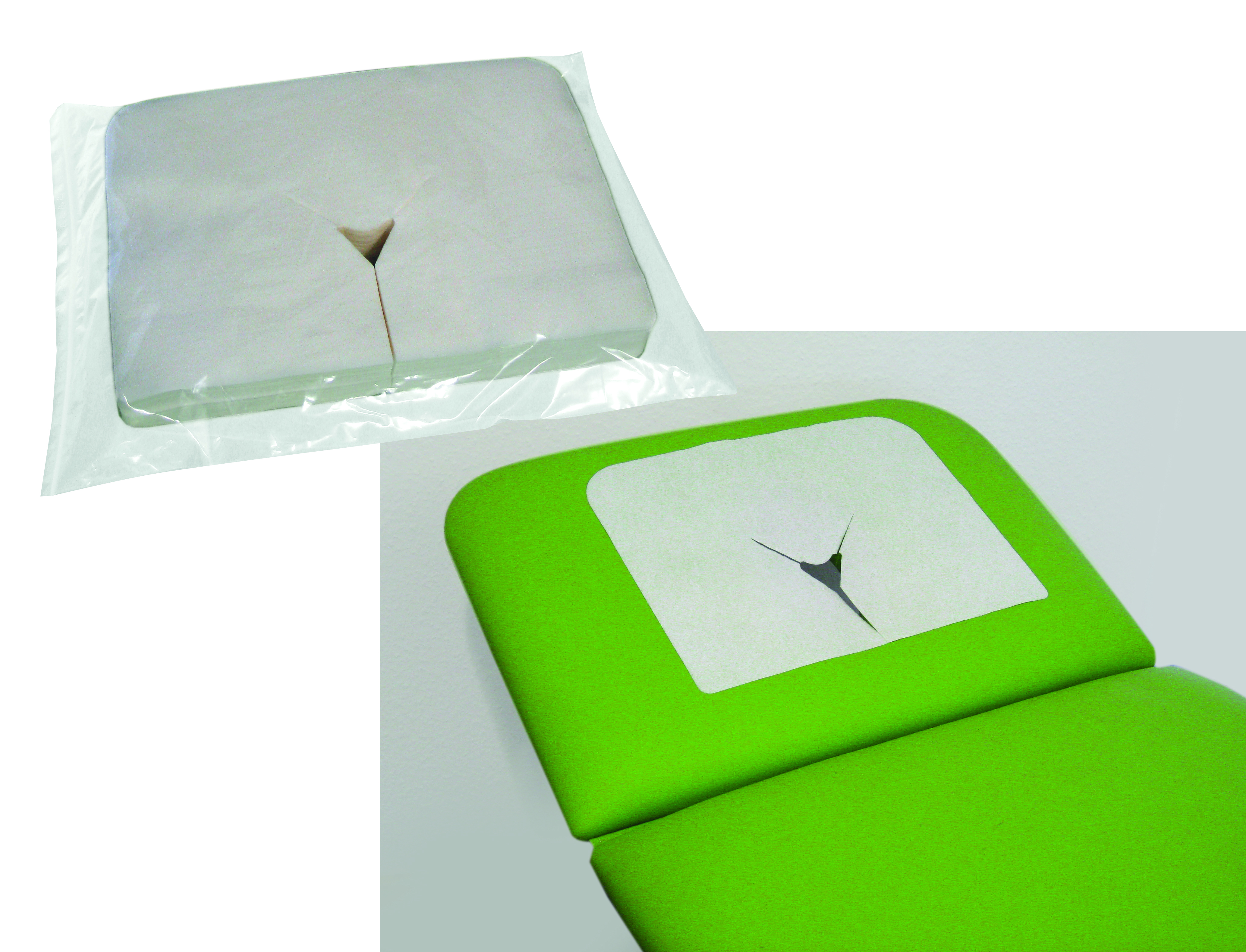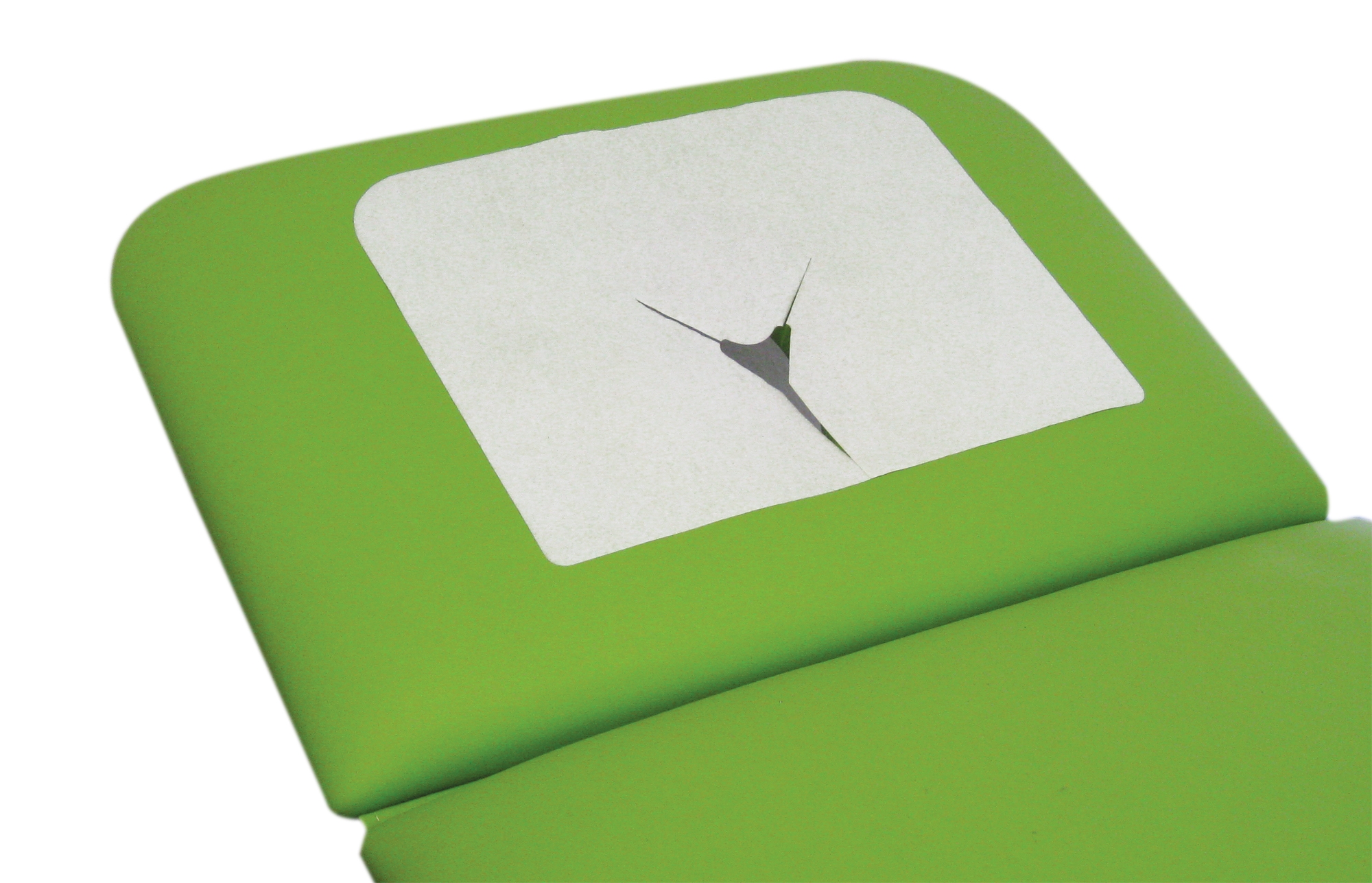 Die Einweg-Auflagen aus extra weichem Airlaid-Papier verfügen in der Mitte über eine Kreuzschlitz-Stanzung. Sie ermöglicht das Einklappen der durch die Stanzung entstandenen Ecken in den Gesichts-/Nasenausschnitt der Behandlungsliege und macht den Weg frei für eine ungehinderte Atmung des Patienten.