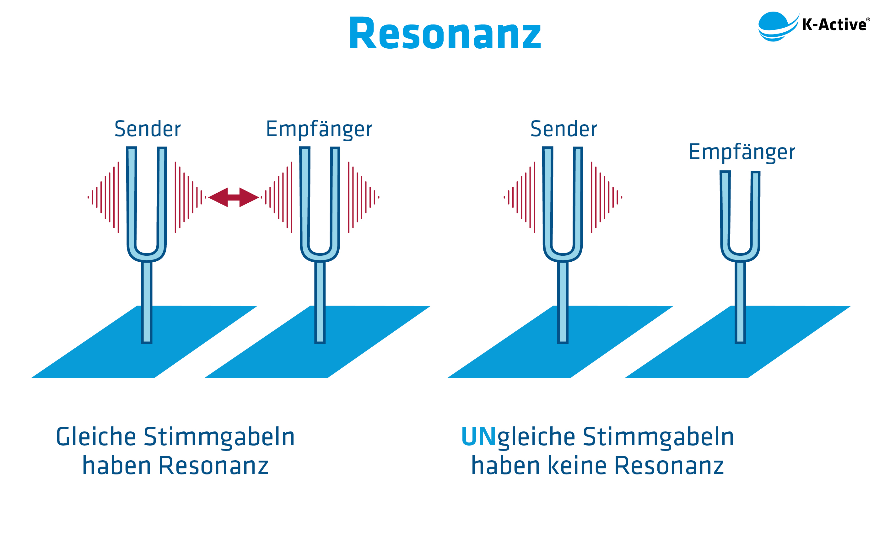 Ein Beispiel: Zwei gleich große Stimmgabeln haben unterschiedliche Frequenzen. Die Gabel mit der geringeren Frequenz geht mit der Gabel der höheren Frequenz in Resonanz und gleicht ihre Schwingung an.
