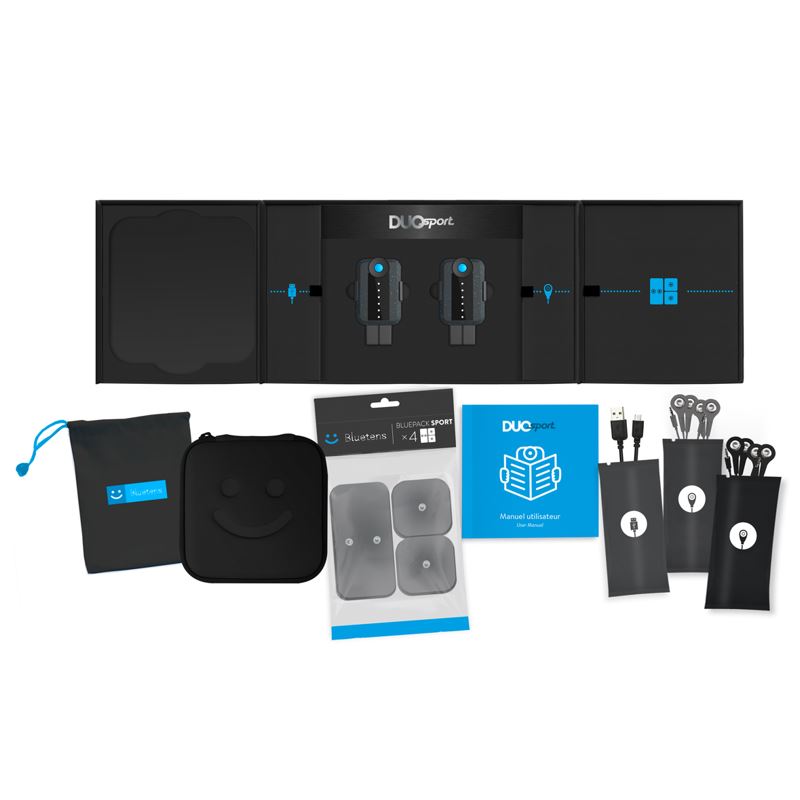 Your Bluetens® Duo Sport comes with various accessories that make using the Bluetens® easier. The set includes 2 USB charging cables, a protective cover, a storage bag, a user manual, and electrode pads in different sizes. So, you have everything you need to use the device right after training without having to buy separate accessories.