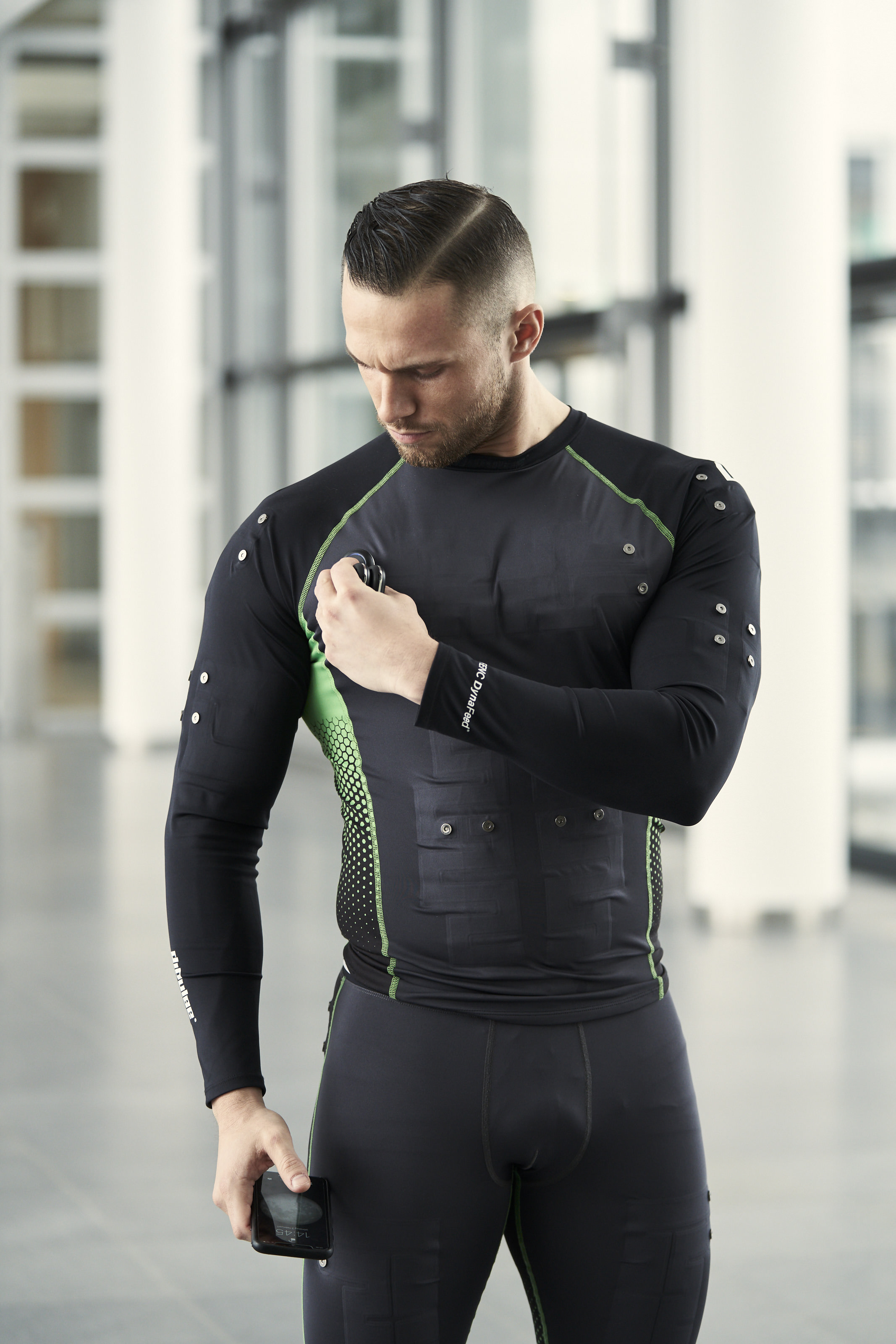In particular the company diPulse has further developed the simple idea of EMS and now enables this training method completely without restrictive cabling. Based on physiological specifications, diPulse calls the application “NMES”: Neuromuscular Electrical Stimulation. In cooperation with the partner company FENC, a specialist for high-tech functional clothing, highly complex textiles with fully integrated and very large contact areas made of carbon nanotubes were developed. At specific, easily accessible muscle points, the conductive tracks are connected via two magnetic contacts to so-called »Stims« that can receive impulses from outside via Bluetooth Smart and then transmit electrical signals to the conductive tracks in the textile fabric. This process is controlled via an app and Bluetooth Smart on the smartphone or tablet.
