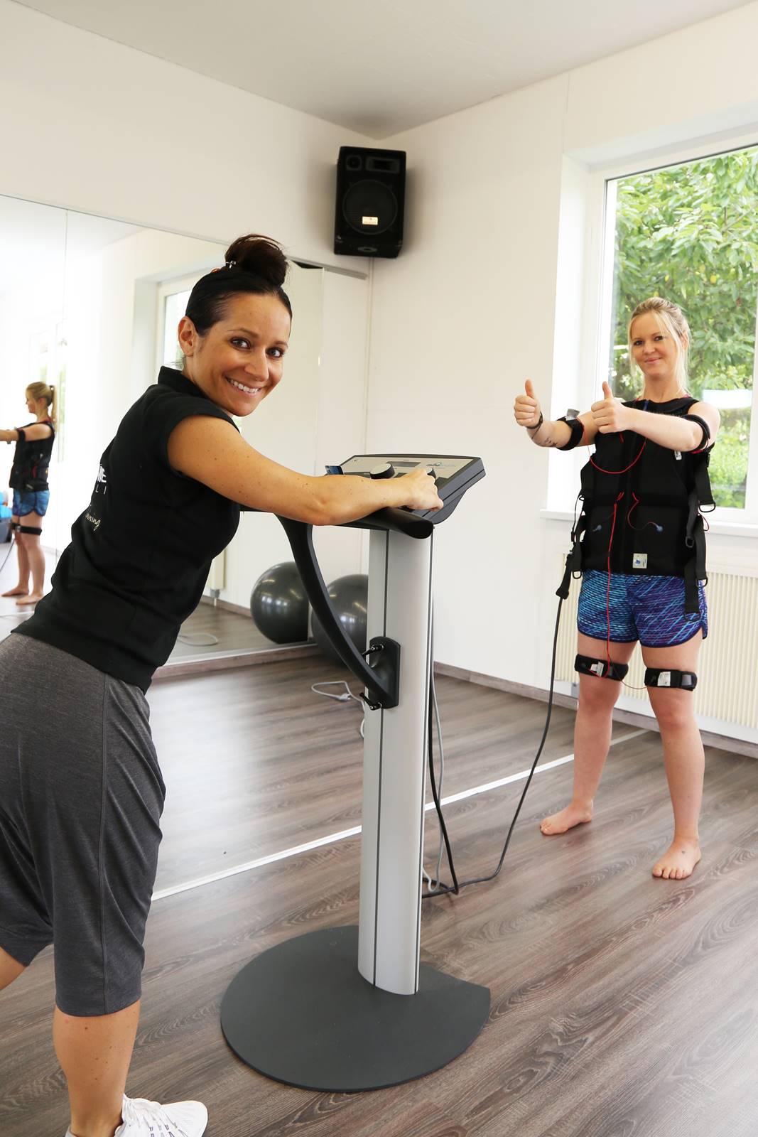 Original EMS training with cabling: The patient is always limited to a certain extent because he is connected to the EMS device via cables. (© Premium personal trainer Stephanie Lutrelli)