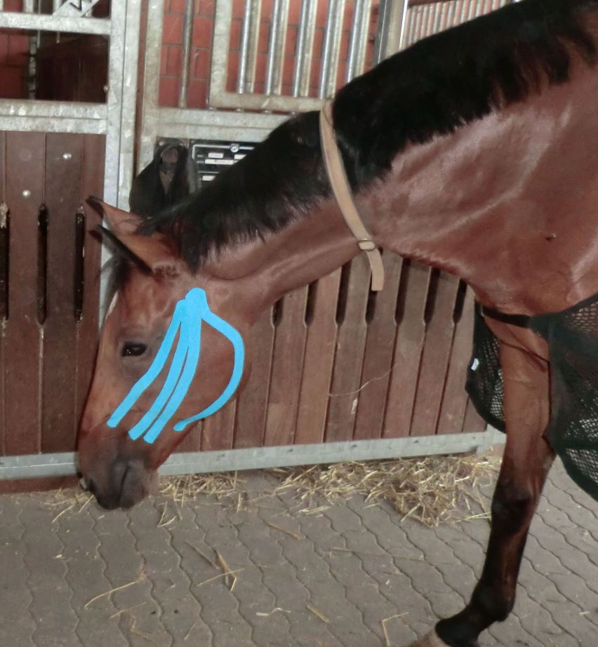 A “Zweibrücker” gelding was presented in my veterinary healing practice with the diagnosis „headshaking“. An irritation of the Nervus trigeminus is assumed, but one could observe that parameter like stress, dust, warmth and increased blood circulation promoted the symptoms. For treatment I chose a nerve application. The Nervus trigeminus has been taken between the Y-tails of the tape. This tape application has a calming effect and can relieve the symptoms. The “shaking” hasn’t been turned off, but I could reach an improvement. It was especially noticeable that the horse relaxed completely and that the application procedure itself had a calming effect. Actually the gelding was presented as very head shy. He usually didn’t accept touching or examining in his face.