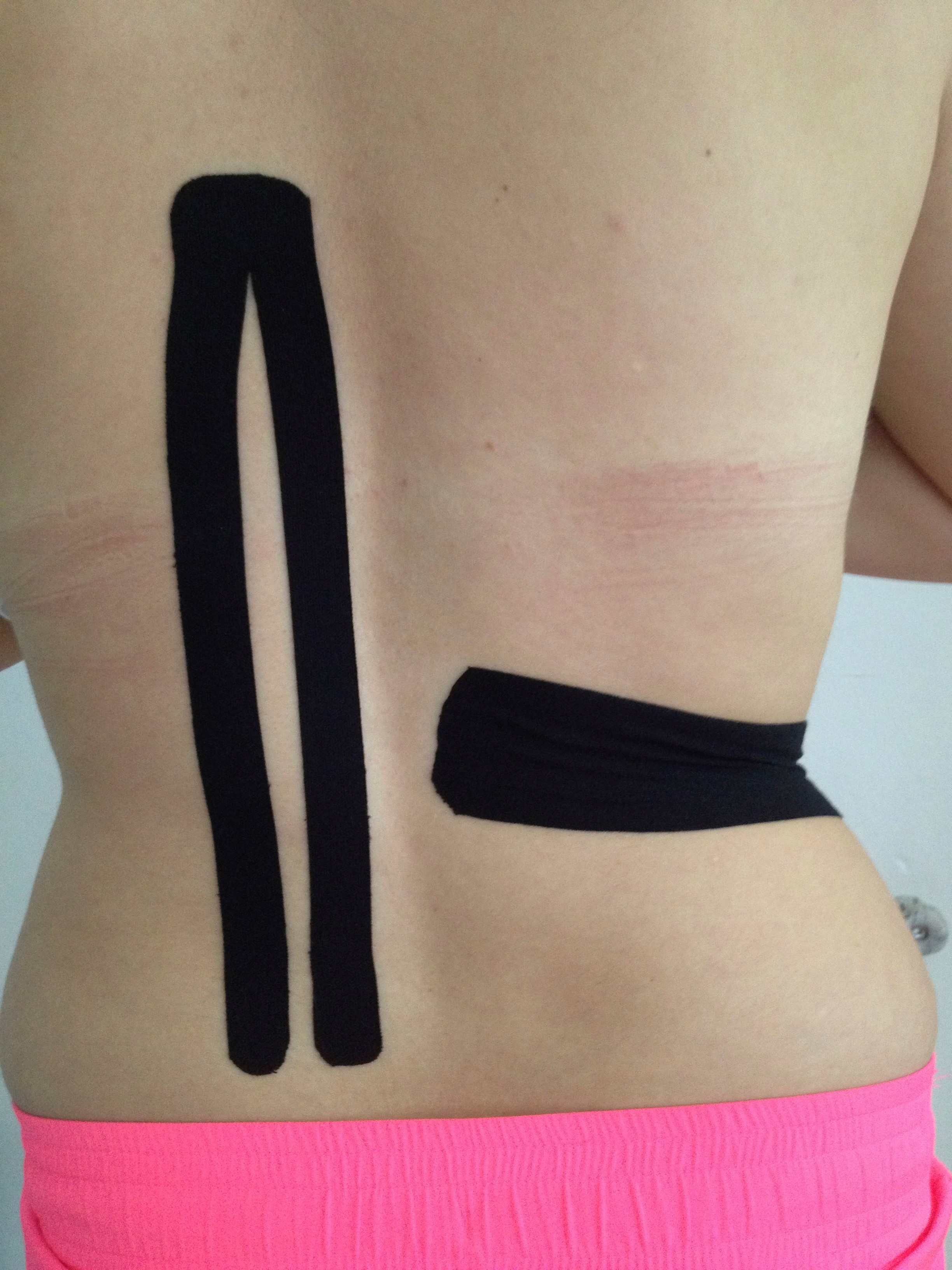 Im konvexen Teil der Wirbelsäule sind zusätzliche Muskeltechniken effektiv. Die Anlagerichtung bestimmt wie immer das Assessement. Die Basis im Bsp. liegt cranial und wird in aufgerichteter Wirbelsäulenposition angebracht, unter maximaler Vordehnung des Gewebes werden die Zügel im Verlauf der Muskulatur angelegt. Das Anreiben des Tapes um den Kleber zu aktivieren gehört als Standard in jede Applikation. Die Technik unterstützt das Raffen des Berges, sowohl im Bereich der Lendenwirbelsäule aus auch der BWS.