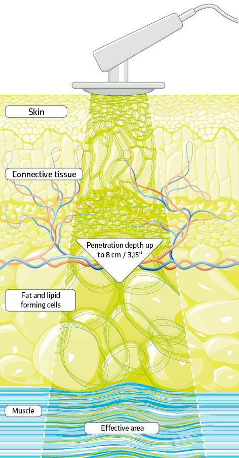 Deep Oscillation is a unique and patented therapy method. By using electrostatic attraction and friction, impulses are generated which pleasantly vibrate the treated tissue, exerting a deep biological effect. In contrast to mechanical forms of therapy, such as vibration, the DEEP OSCILLATION® effect occurs in the tissue itself and over the entire tissue depth (up to 8 cm deep!). It thus reaches the skin, conductive tissue, subcutaneous fat tissue, muscles, blood and lymph vessels.