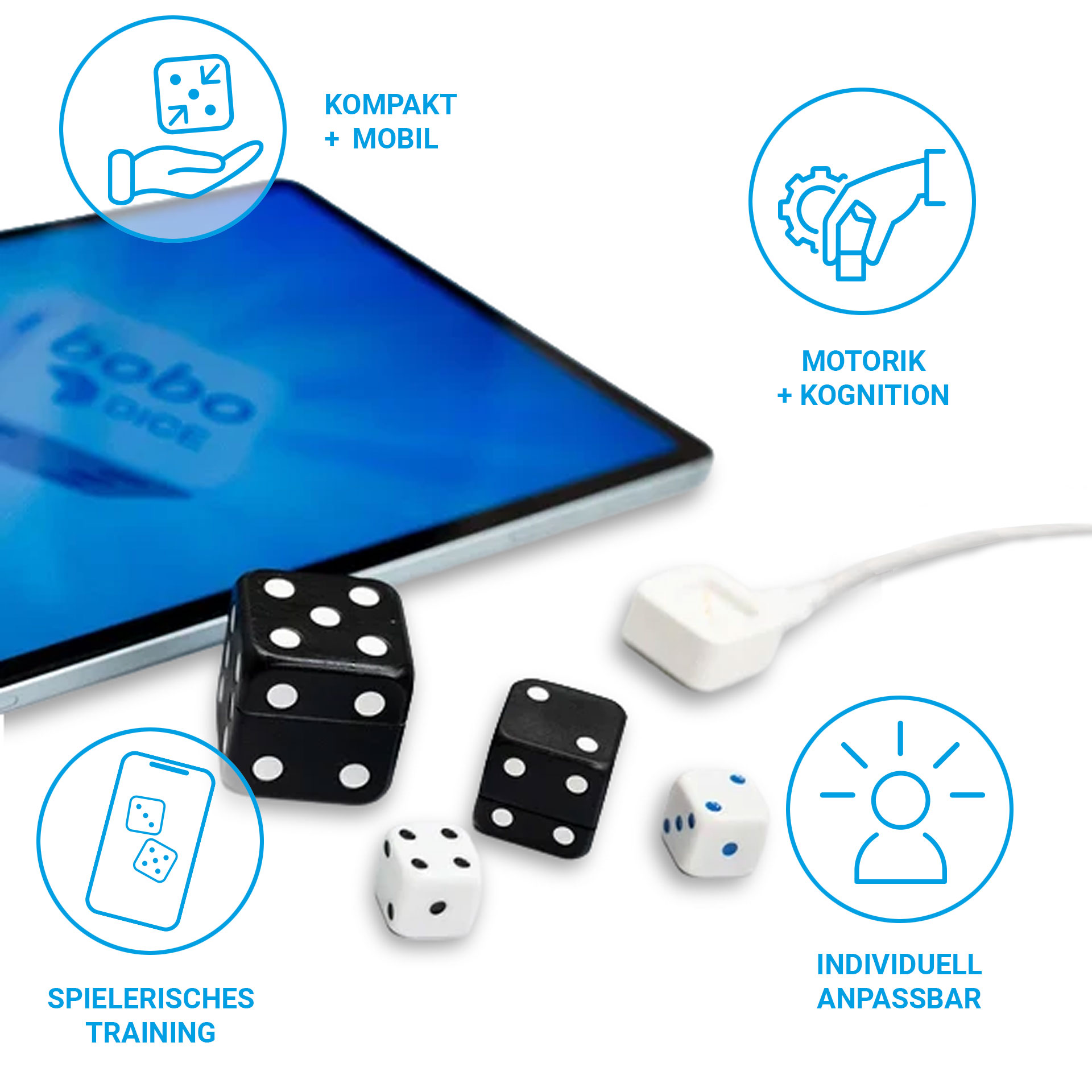 BoBo Dice Pro is an intelligent digital training and therapy system made up of smart dice. Combined with the free BoBo Balance App, it enables playful and effective training of fine motor skills, coordination, reaction speed, and cognitive abilities.
