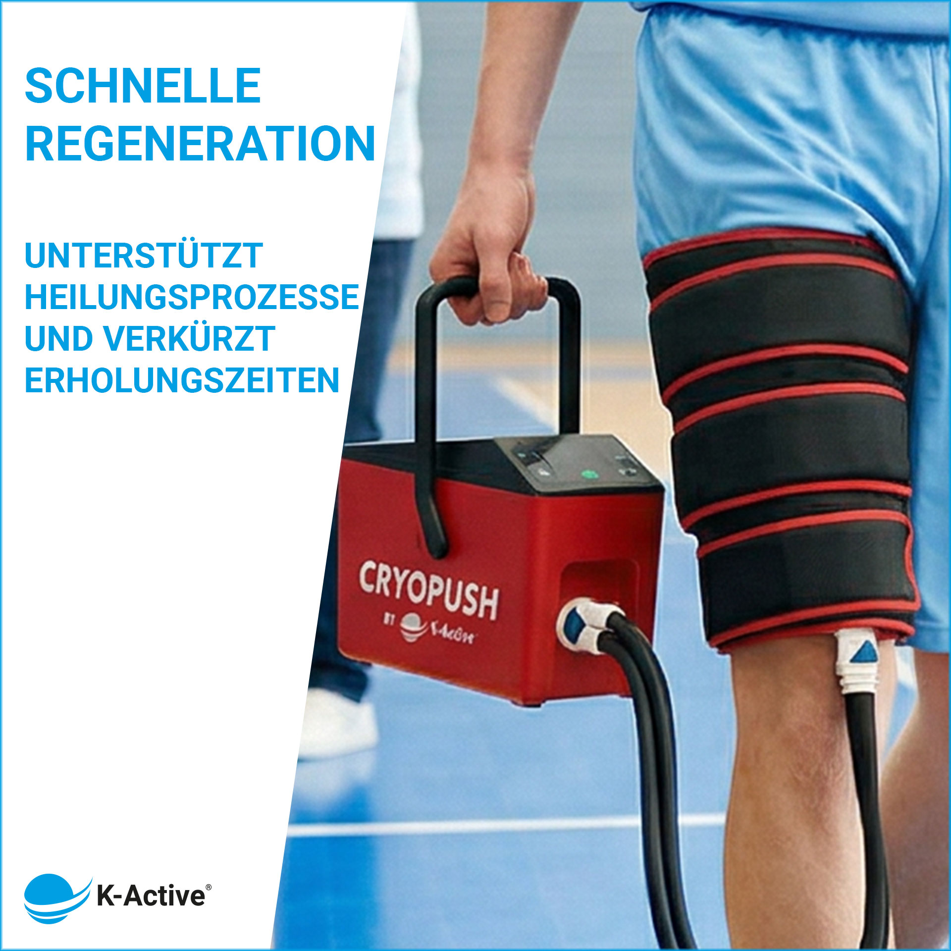 The CryoPush by K-Active is a professional cold compression system that combines controlled cold therapy with active, intermittent compression. The cold compression device specifically supports pain relief, healing, and recovery. This can be particularly important after intense training sessions, in cases of acute sports injuries, or during postoperative rehabilitation - such as when cooling the knee, shoulder, or hip after surgery. It thus represents a key component in the return-to-competition process.