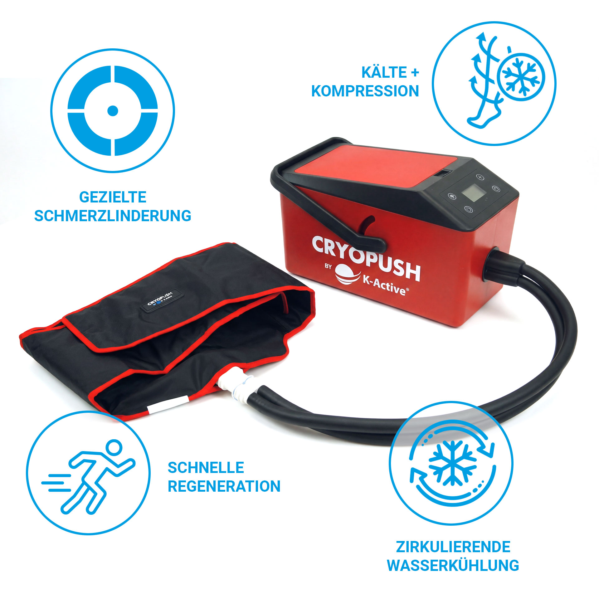The unique advantage of the CryoPush by K-Active: It is a device with four cooling sleeves. This allows the cold compression system to be flexibly applied to different body regions, depending on the needs during training, therapy, or rehabilitation. This means the CryoPush by K-Active is a cost-effective cold compression system due to its versatility.