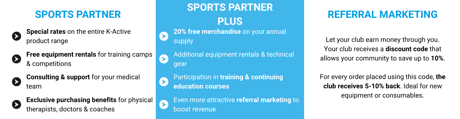 The K-Active Sports Partner Program combines high-quality medical equipment with exclusive special rates and real added value for YOUR club. Plus, you´ll earn money through an integrated referral marketing program while simultaneously boosting your athletes´ performance, recovery, and health. Since 2006, even the mediacl teams of Olympians from various countries have trusted our products. We want to pass this quality on to YOU.