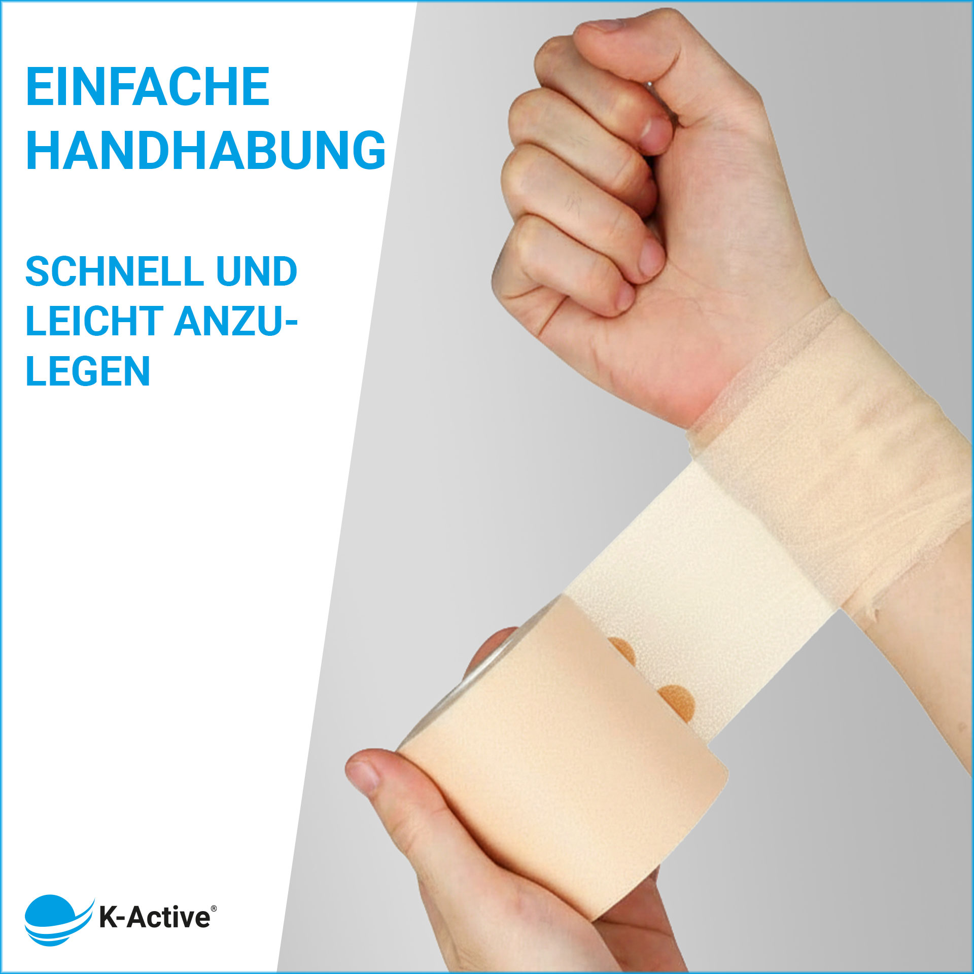 Das K-Active PreTape lässt sich einfach von Hand reißen und ermöglicht damit eine schnelle und unkomplizierte Anlage des Verbandes ganz ohne zusätzliches Werkzeug. Gerade im Sport, im therapeutischen Alltag, bei häufigen Anwendungen oder unterwegs spart das Zeit und vereinfacht die Handhabung deutlich. Die kontrollierte Reißbarkeit sorgt dafür, dass das PreTape bedarfsgerecht zugeschnitten werden kann, ohne an Funktion oder Schutzwirkung zu verlieren. Ein praktisches Detail, das den Arbeitsalltag erleichtert und die Anwendung noch effizienter macht.