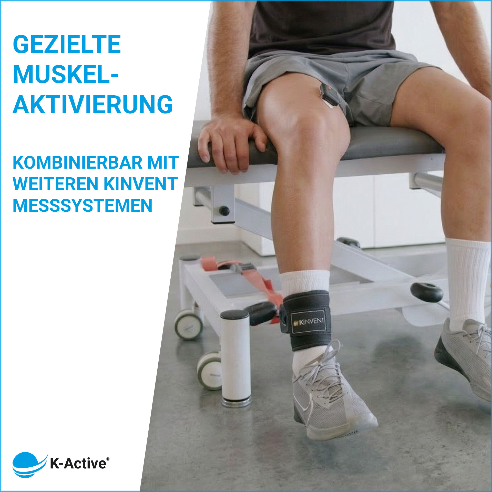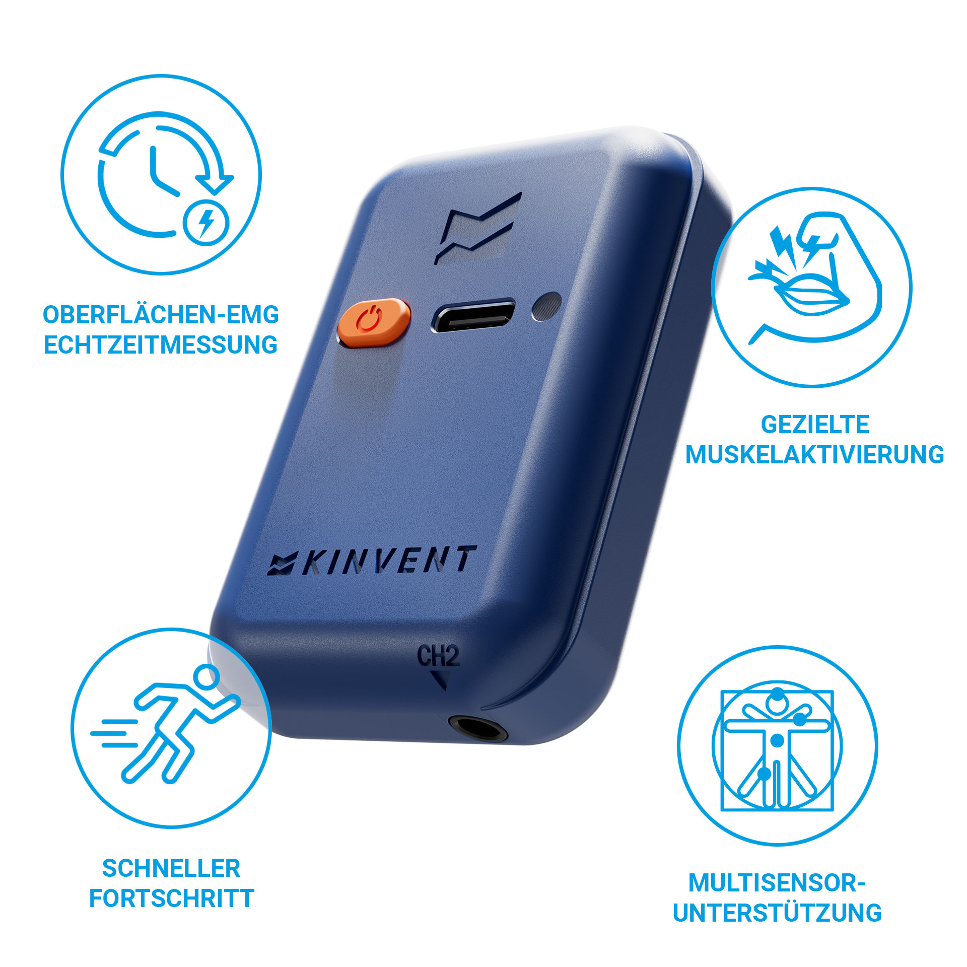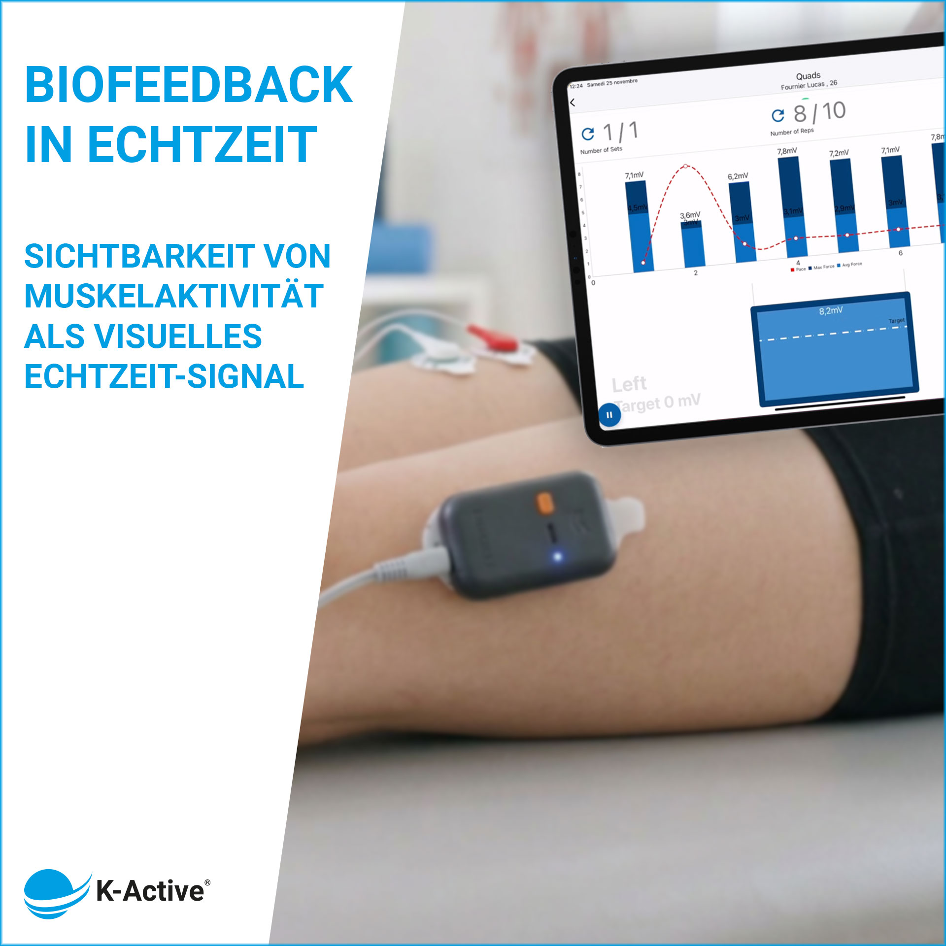 The K-Myo is placed on the skin using electrodes and measures electrical muscle activity non-invasively. The data is transmitted wirelessly in real time to the Kinvent app, where it is displayed as visual biofeedback.