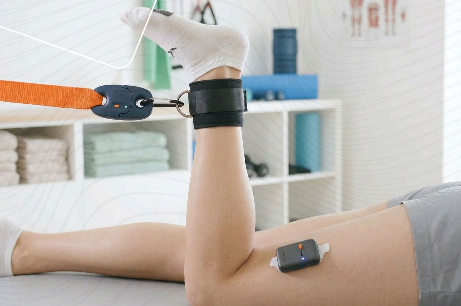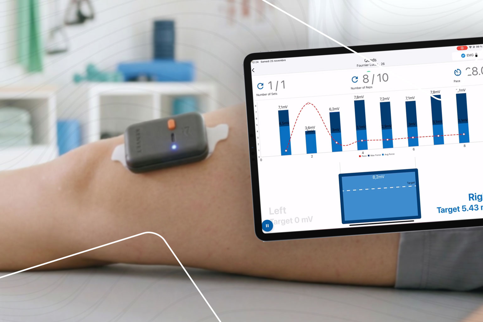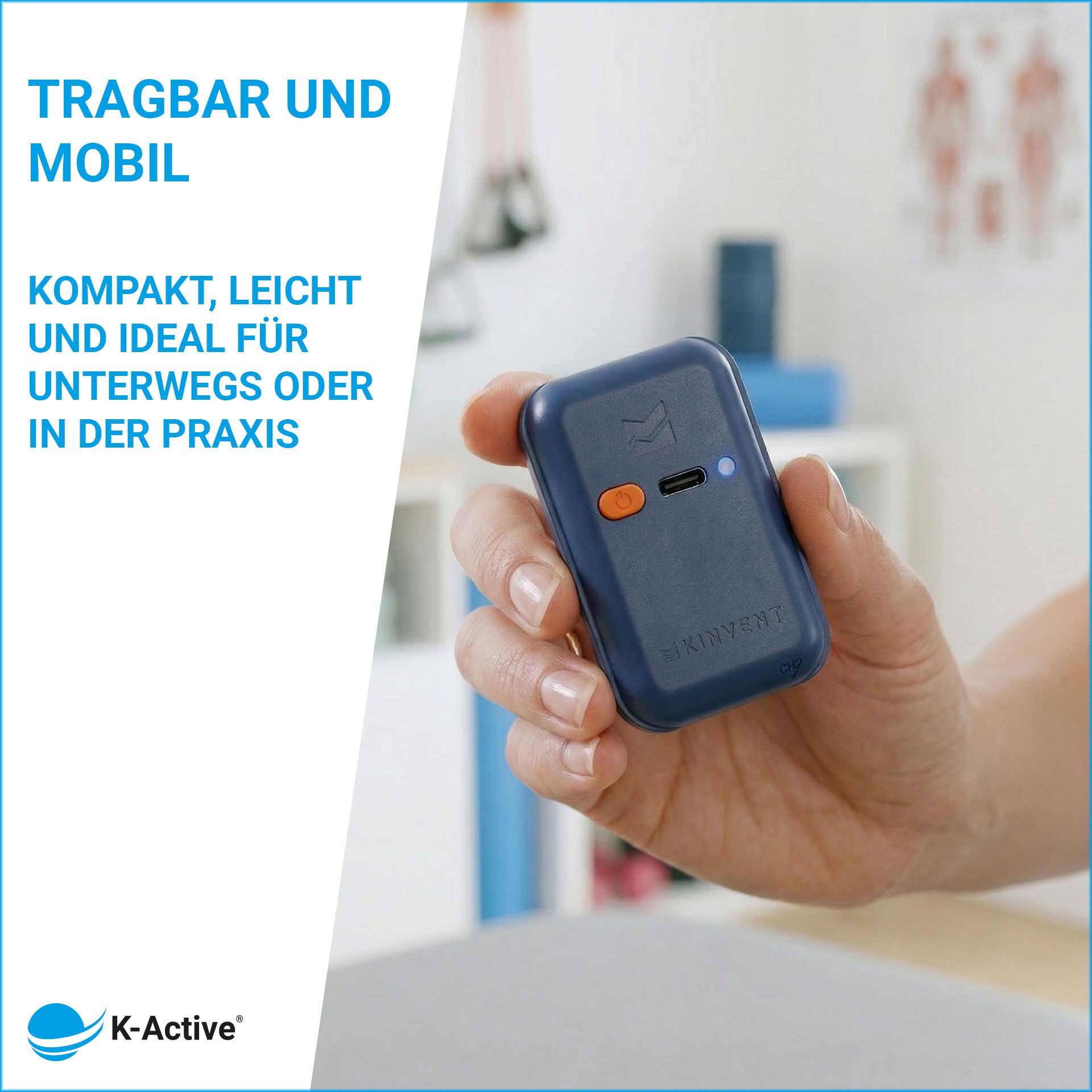 The K-Myo is placed on the skin using electrodes and measures electrical muscle activity non-invasively. The data is transmitted wirelessly in real time to the Kinvent app, where it is displayed as visual biofeedback.