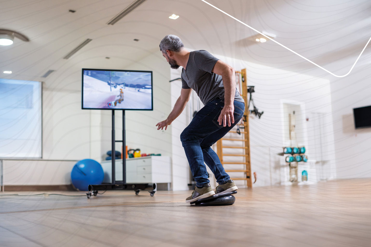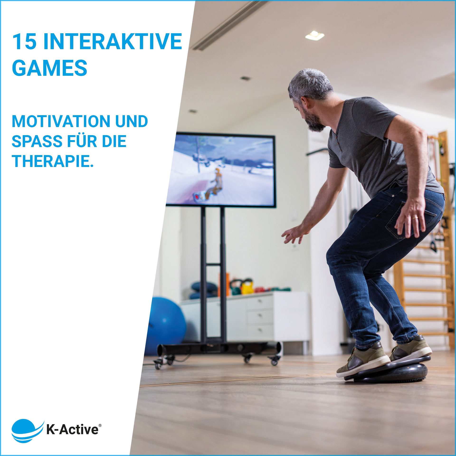15 interactive balance games transform therapy exercises into motivating challenges, ranging from a snowboarding game to a maze. Patients train with greater focus, stay engaged longer, and perform their exercises more consistently.