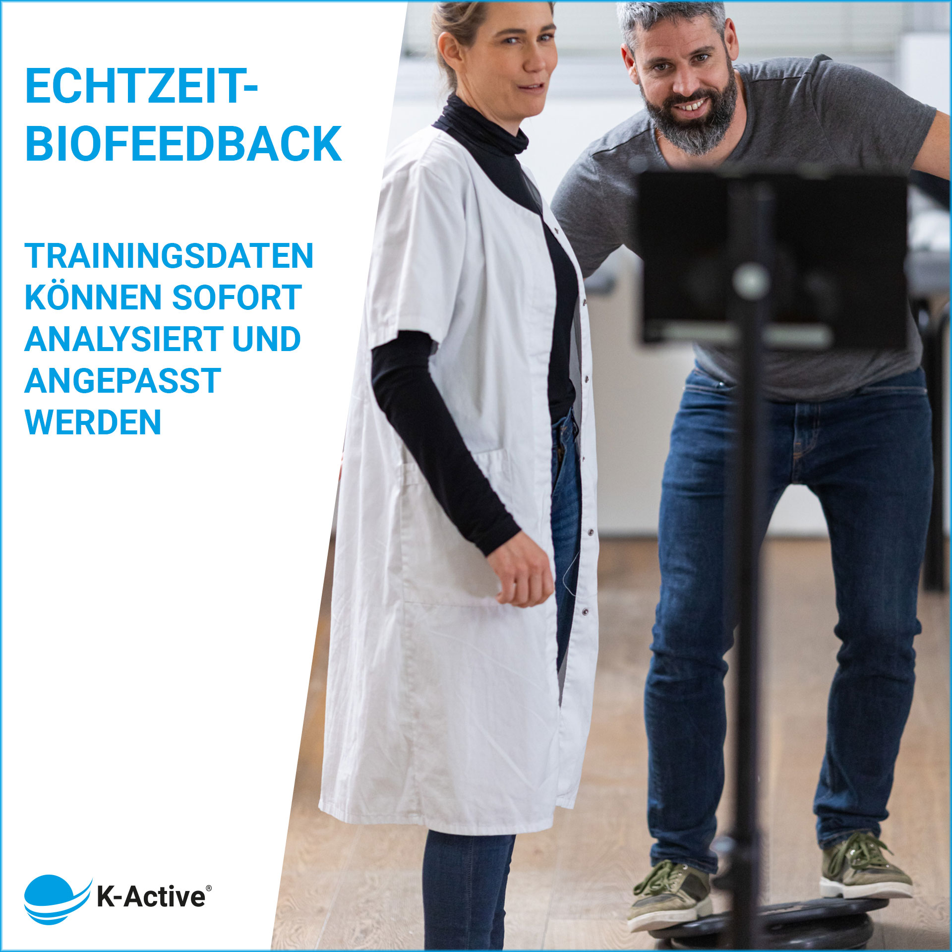 Balance training: The board (approx. 40 x 30 cm, weight capacity up to 200 kg) is placed on a balance cushion. The sensor visualizes every shift in weight in real time, allowing patients to train their balance, coordination, and core stability with immediate feedback. Suitable for everything from fall prevention in seniors to proprioceptive training in competitive sports.