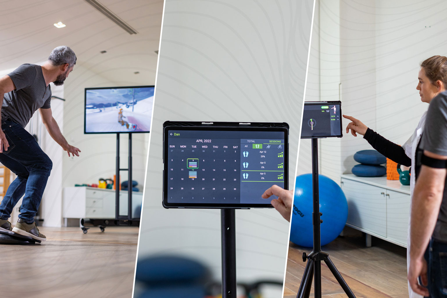 15 interactive balance games ensure variety and adherence to therapy. Therapists can choose from rehabilitation programs or create their own training plans in seconds.
