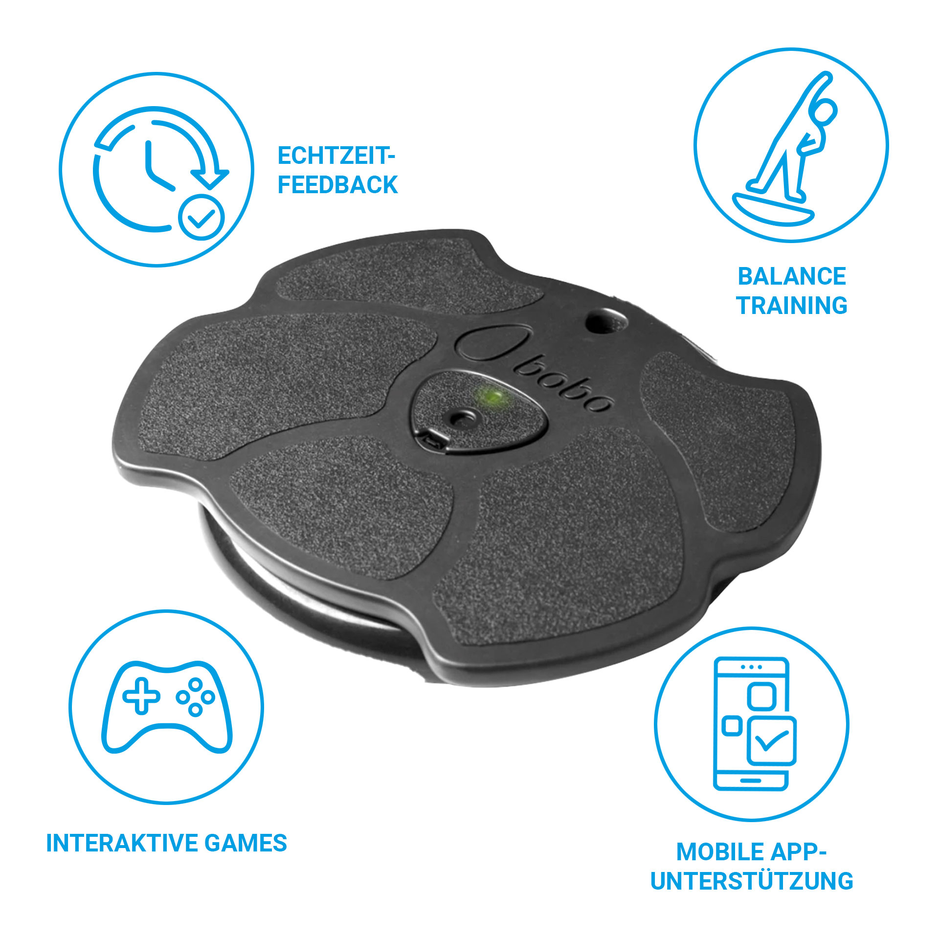 The BoBo Pro 2.0 is a smart training device with a motion sensor and app that combines balance training, range of motion (ROM) measurement, and cycling in a single system. It is used in physical therapy practices, rehabilitation clinics, and competitive sports to make therapeutic exercises measurable, motivating, and individually customizable.