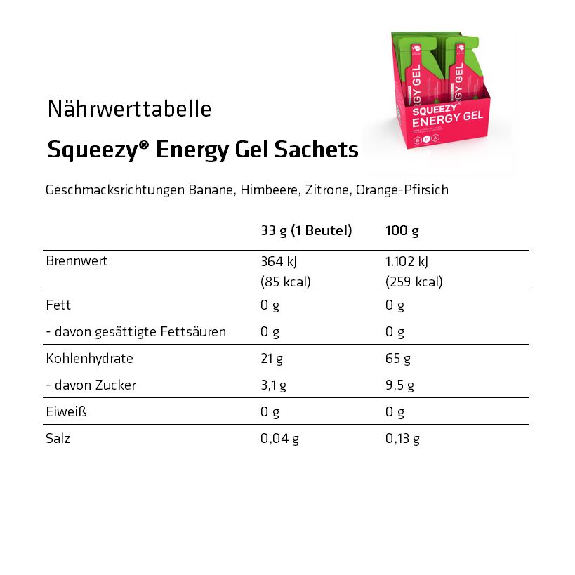 Properties "Squeezy Energy Gel Box 12 sachets of 33 g"