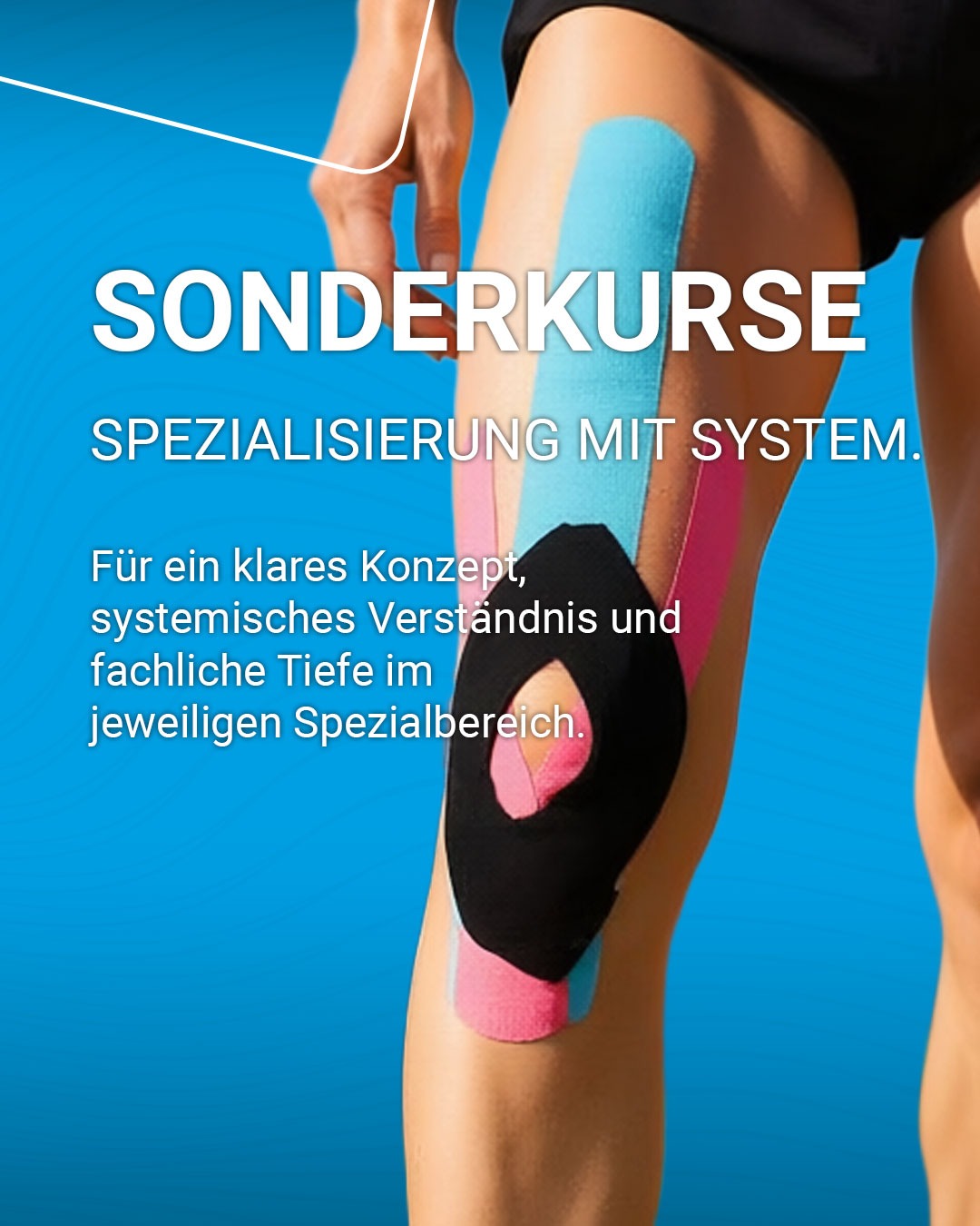 Standardisierte Anwendungen stoßen in spezialisierten Fachbereichen schnell an ihre Grenzen. Die Sonderkurse verbinden deshalb das Fundament des Kinesiologischen Tapings und den ganzheitlichen K-Active®-Ansatz mit den spezifischen Anforderungen der jeweiligen Fachdisziplin: