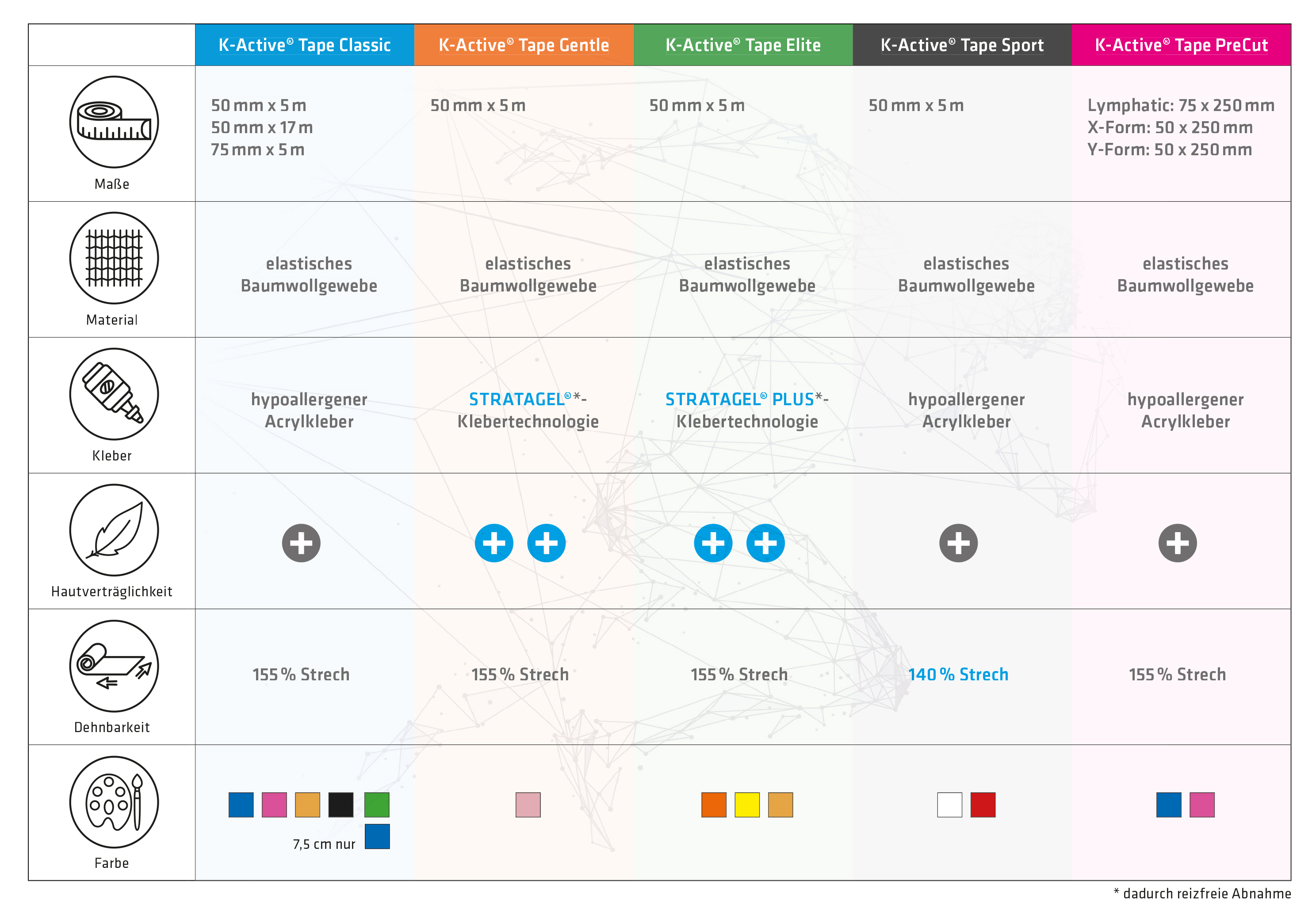 Man kann es auch als das „Power Gentle Tape“ bezeichnen, denn das K-Active® Tape Elite vereint die Sanftheit des Tape Gentle mit der Haltbarkeit des Tape Classic. Der weiche Baumwollstoff ist mit dem hochinnovativen Stratagel-Plus Kleber beschichtet, der das Tape Elite zu dem Tape mit den vielseitigsten Einsatz-Möglichkeiten macht: Sport, Beauty-Taping, Therapie und extreme Herausforderungen wie Schwimmen in Salzwasser können seiner Haftwirkung nichts anhaben. Das Tape Elite gibt es in den Farben Beige, Gelb und Orange und in der 1er und 6er Box.